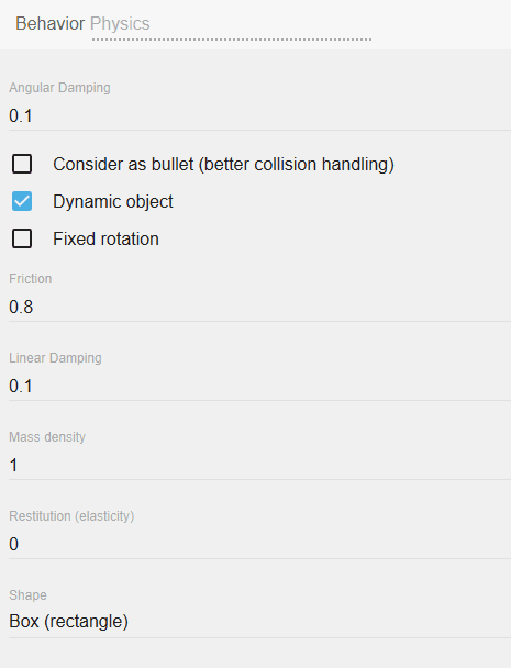 The "Physics" behavior allows objects to behave according to the laws of physics. Physics behavior applies real world physics to your game objects. Game objects can move, fall, roll, bounce and collide.