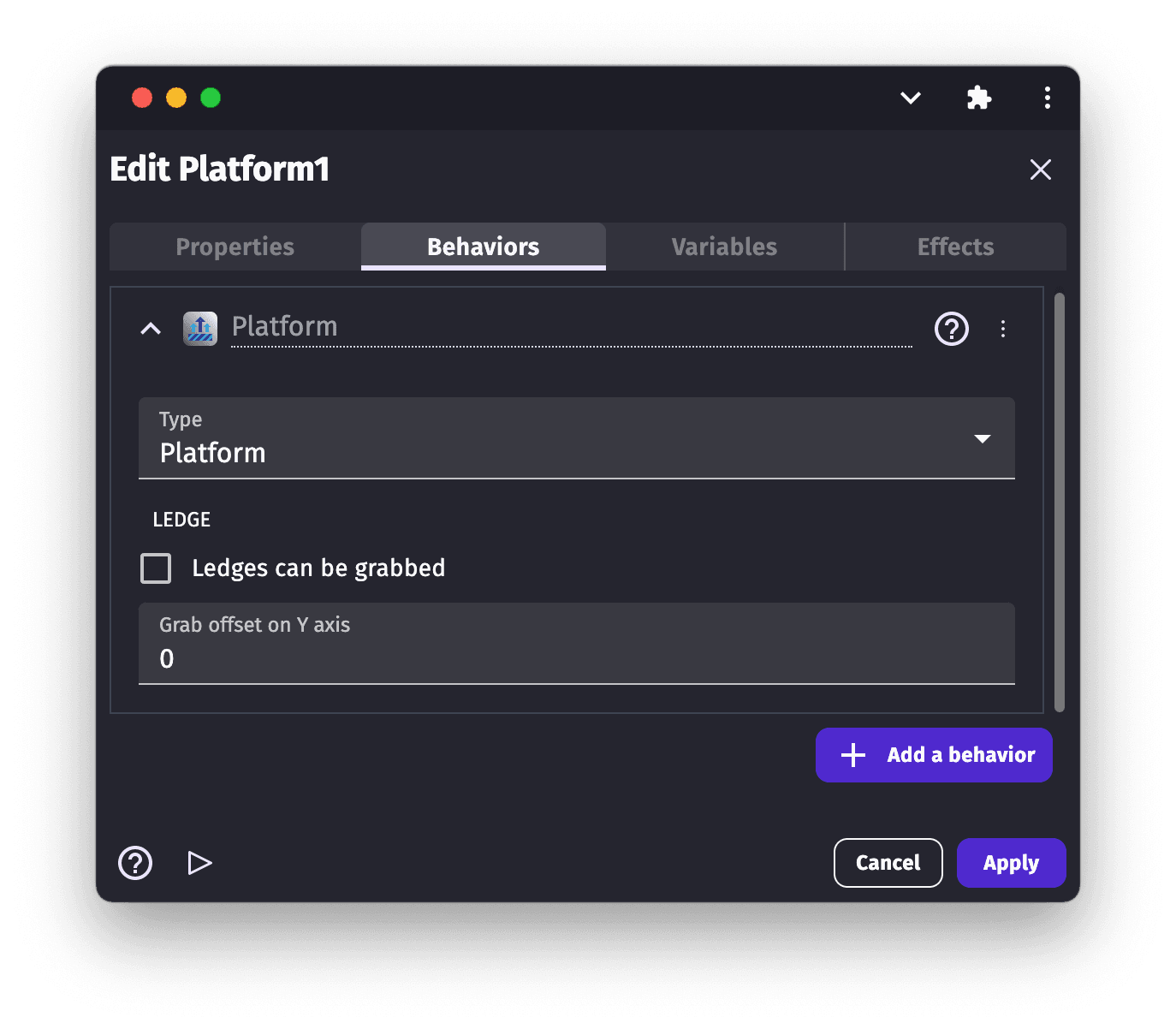As with the Platform Behavior, we have the "Grab the ledge" option for the "Platformer character". This option allows the character object to grab the ledge of the platforms. The option is disabled by default. To enable it, tick/check the box in the options list.