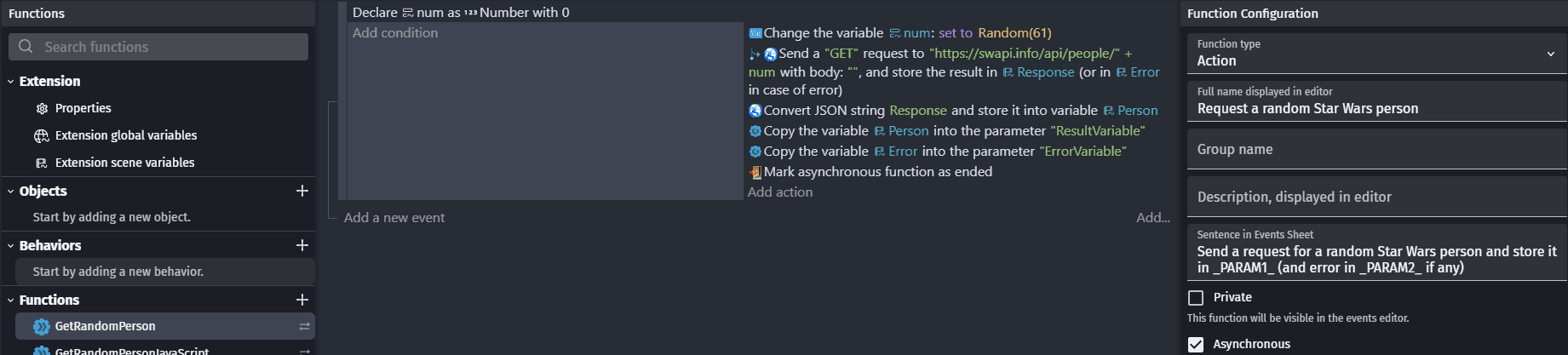 The full example which contains an asynchronous function with events or JavaScript can be open is accessible online (Open the example in GDevelop).