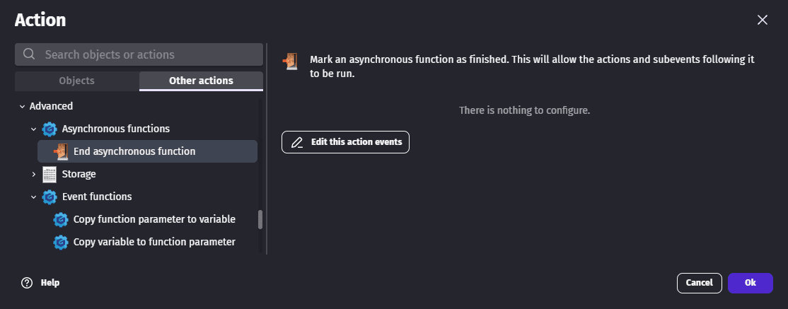 Don't forget to use the action "End asynchronous function" to mark the end of the action. Otherwise, the actions which follow your function in the scene events will never be executed.