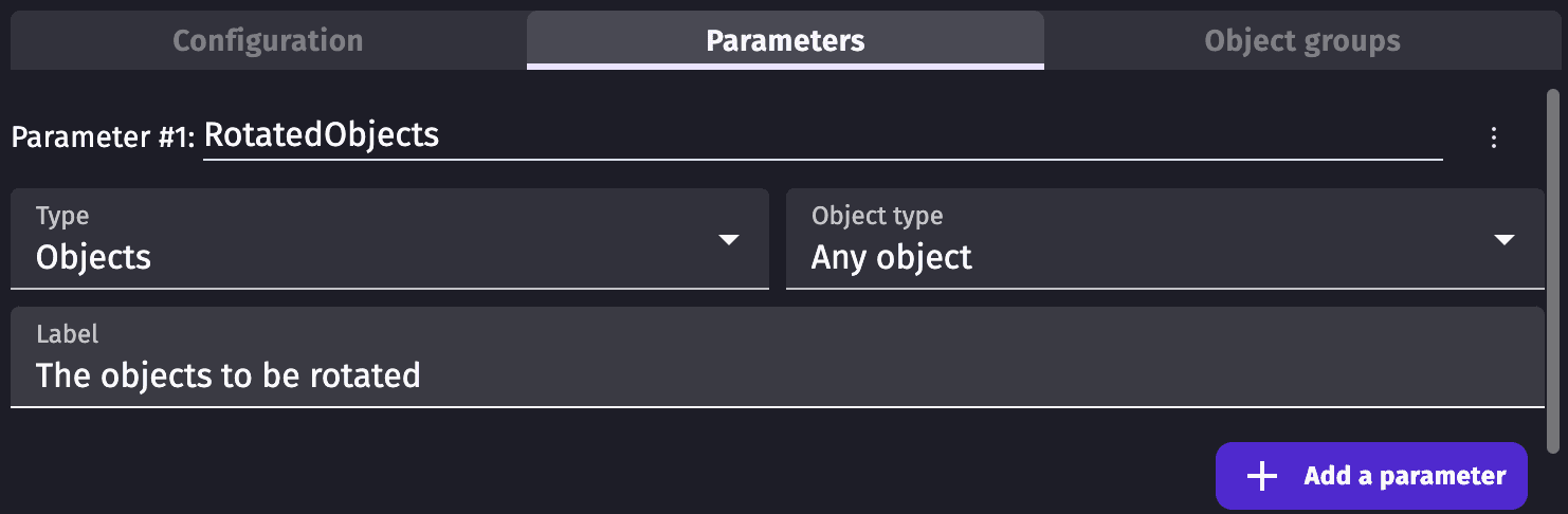 In this case, with a parameter named RotatedObjects, if you want rotate the object by 45 degrees, you can do: