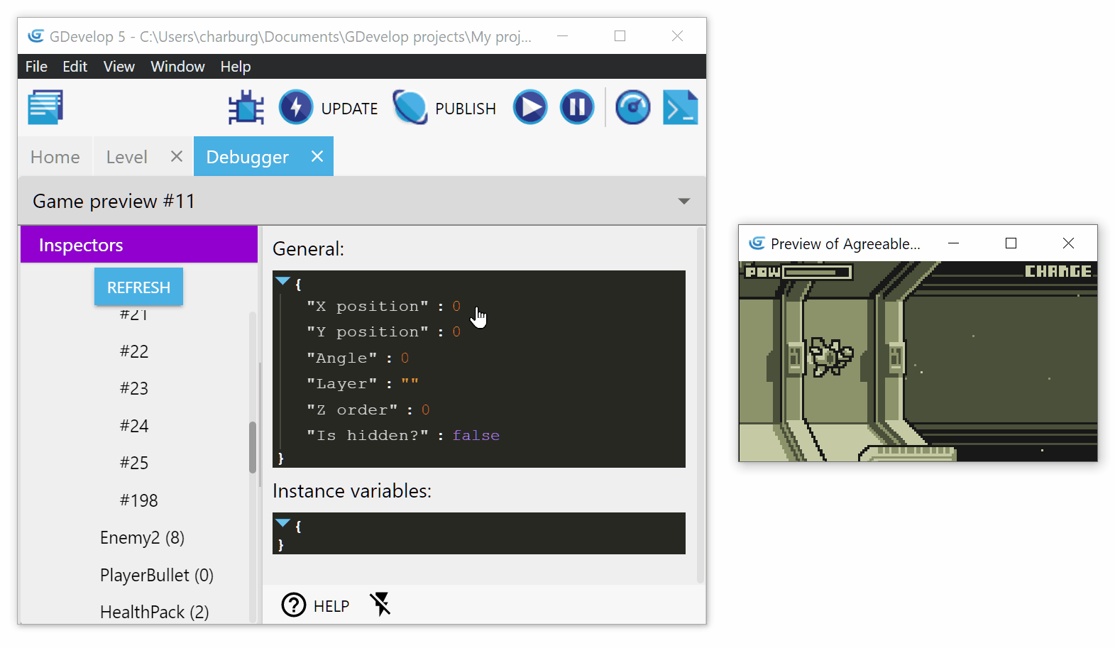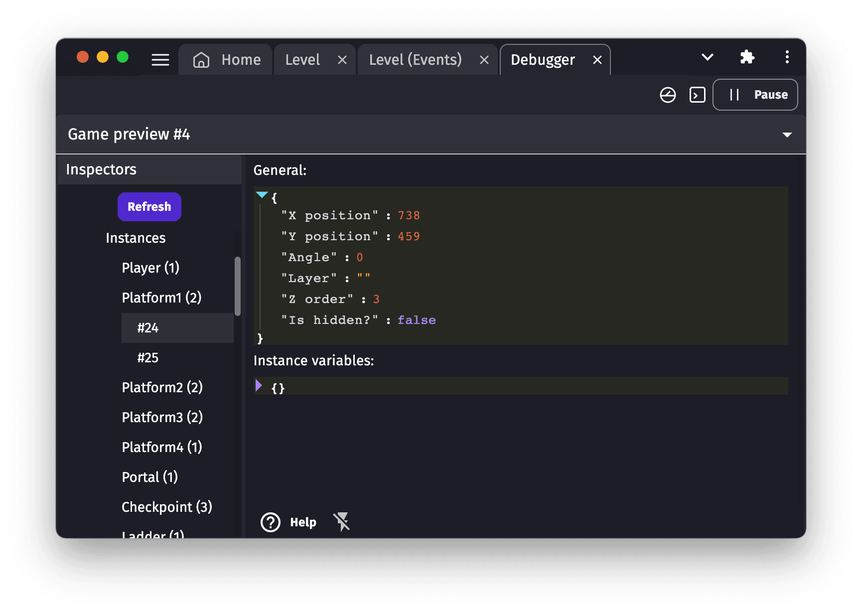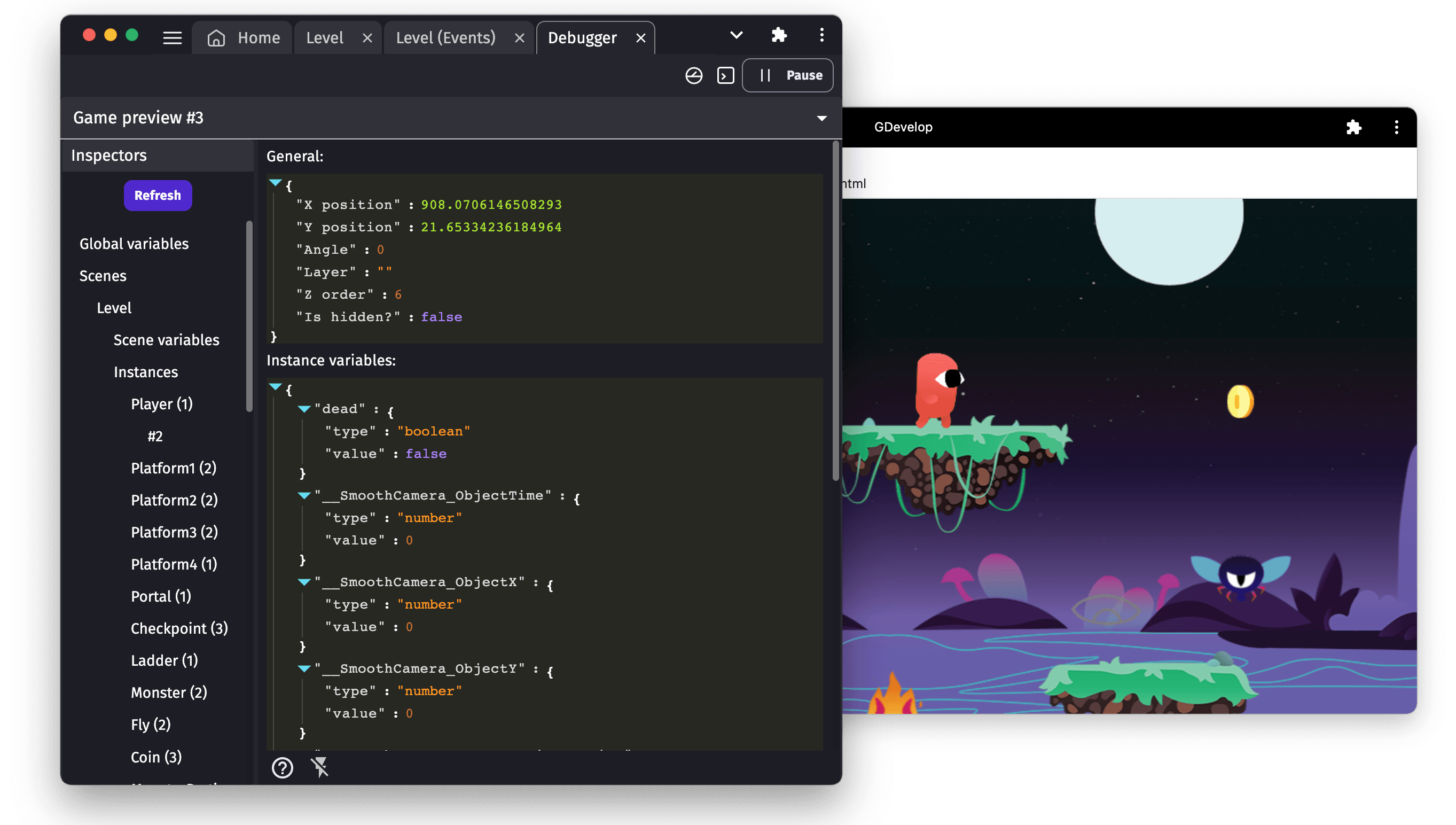 The Debugger is a tool that lets you inspect the contents of your game. Allowing you to inspect the global variables, scene variables, and variables of instances of your objects. You can pause the game at any time, and check to see why something isn't working as intended or to do quick tests in your game.