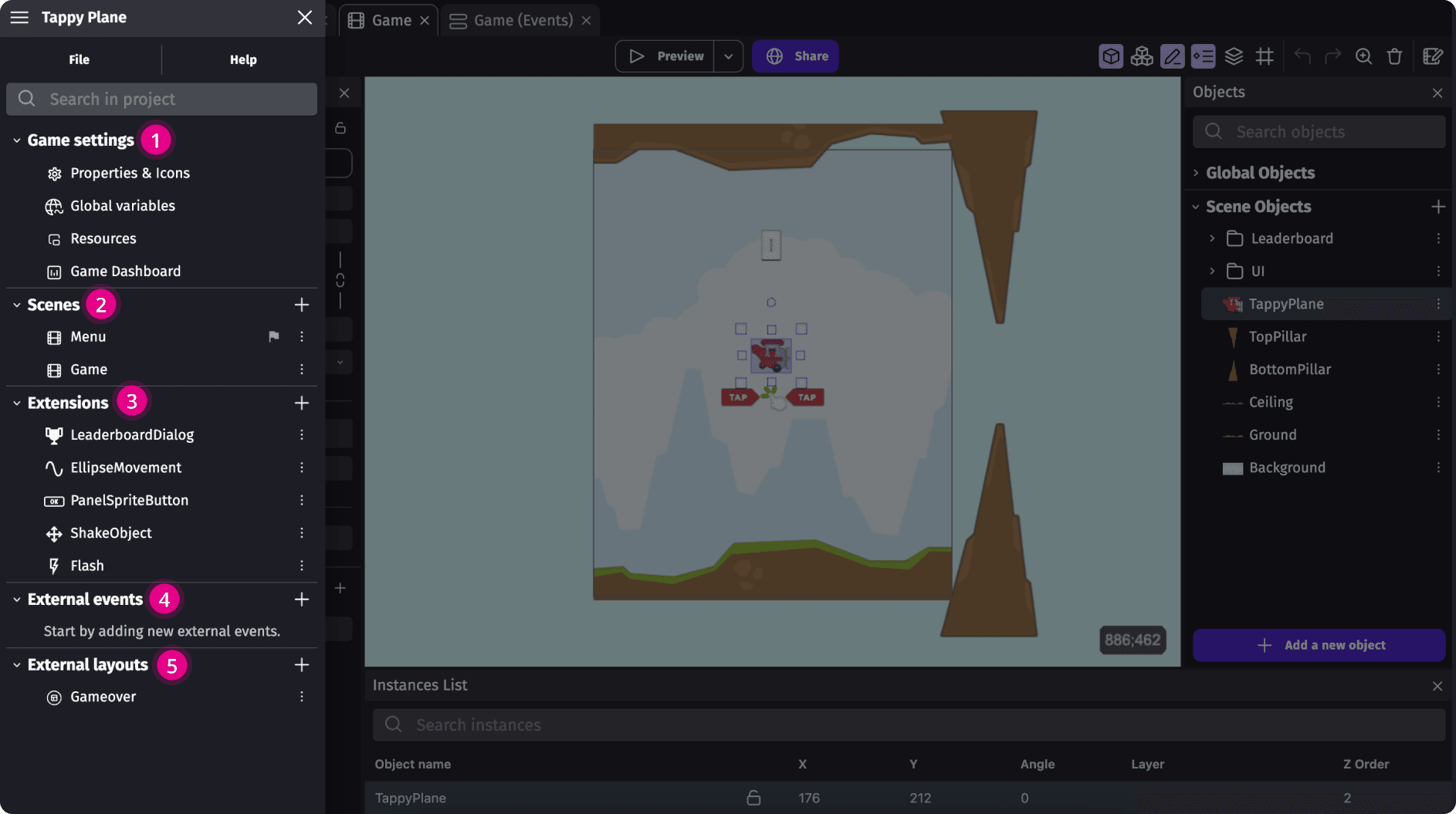 • 2. Scenes: Scenes are the different screens and levels in your game. Everything in GDevelop is created in scenes.