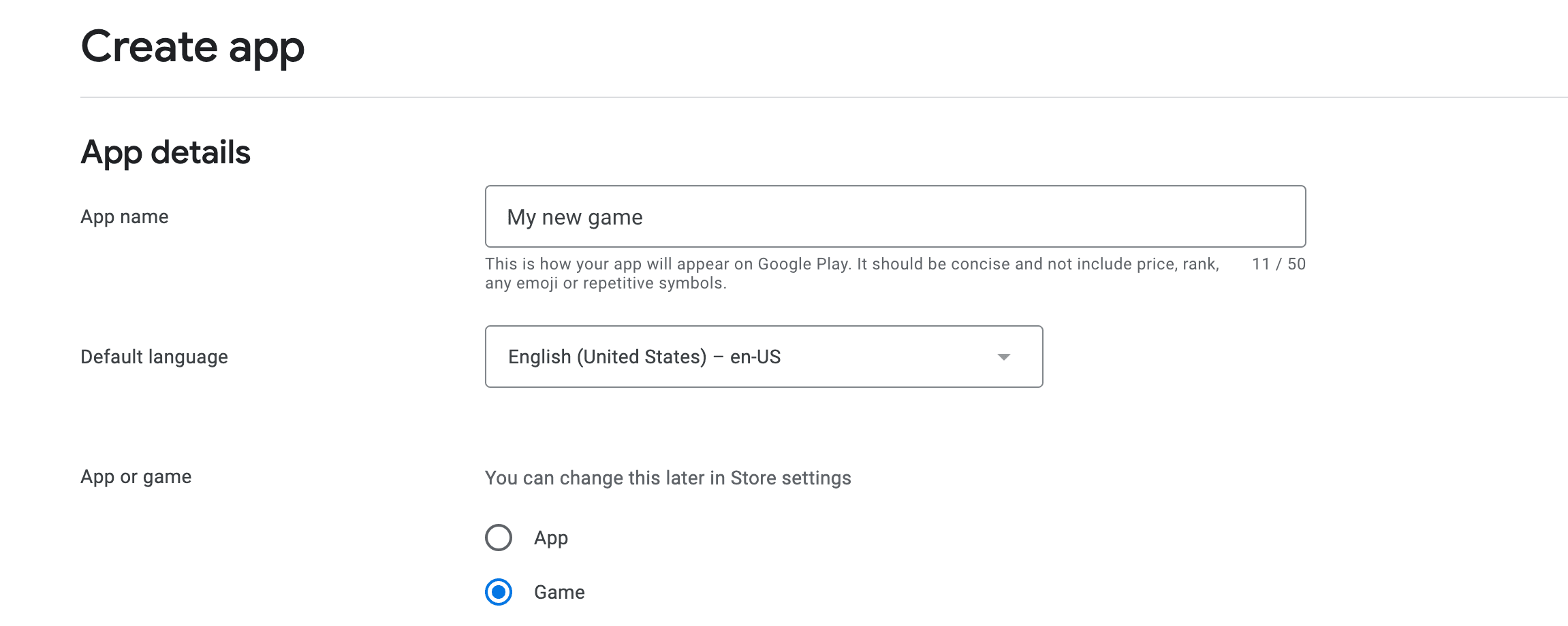 Enter a title and choose a language. The application is created on the Play Store and you're now able to complete the information that will be displayed on the Play Store: