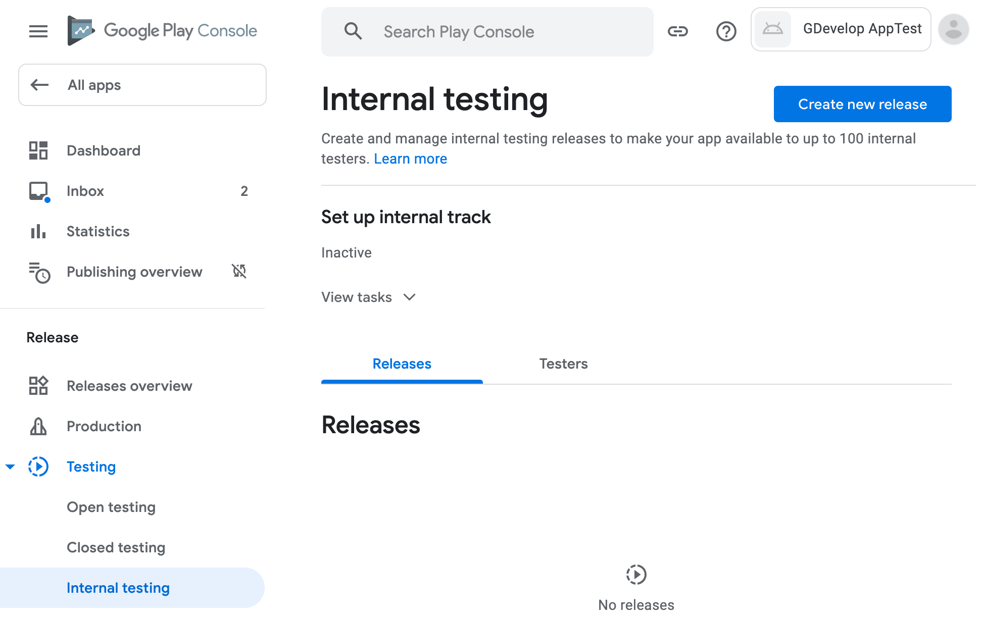 In the menu on the left, find the Release section. Choose Production, Open testing, Closed testing or Internal testing according to how you want to distribute your game first. We recommend you start with Internal testing. You can then make a "Production" release once you're satisfied with the game.