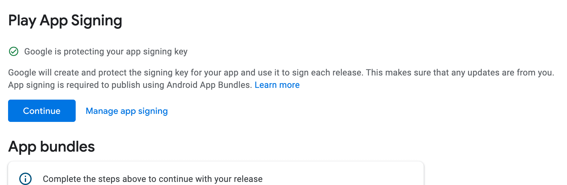 You are asked for Google Play App Signing, click on Continue.