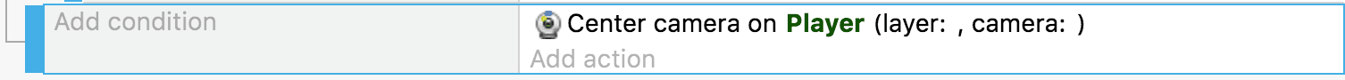 Let's add another event to have the camera follow the player. There are multiple ways to achieve this. The simplest is to add an event with no conditions and the action called Center the camera on an object: