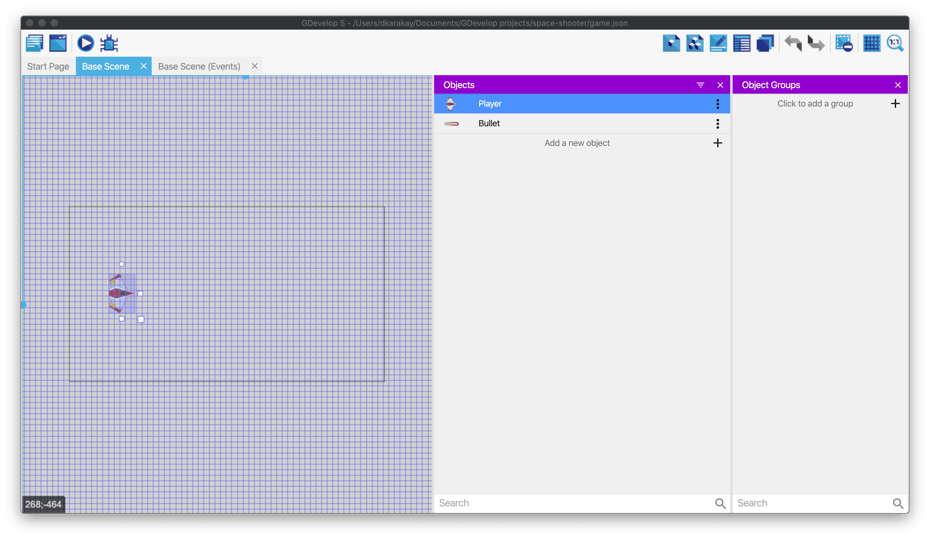 Firstly, we need to add a bullet object. Follow the steps in the previous episode and add a sprite object. Use the name Bullet and add "laser_player.png" image for the object.